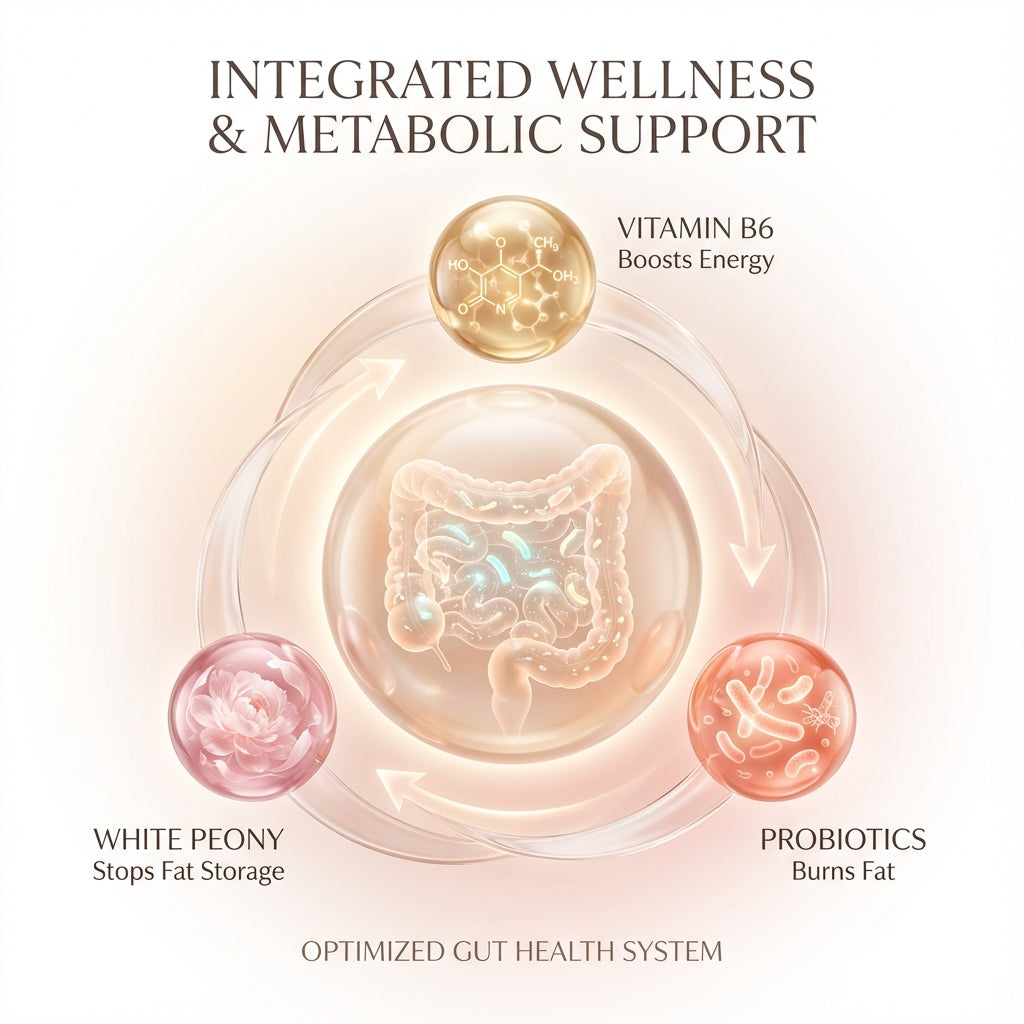 White Peony reduces insulin resistance while B6 supports neurotransmitter production for mood and metabolism. Combined with probiotics that restore fat-burning bacteria, they reverse the metabolic slowdown menopause causes.