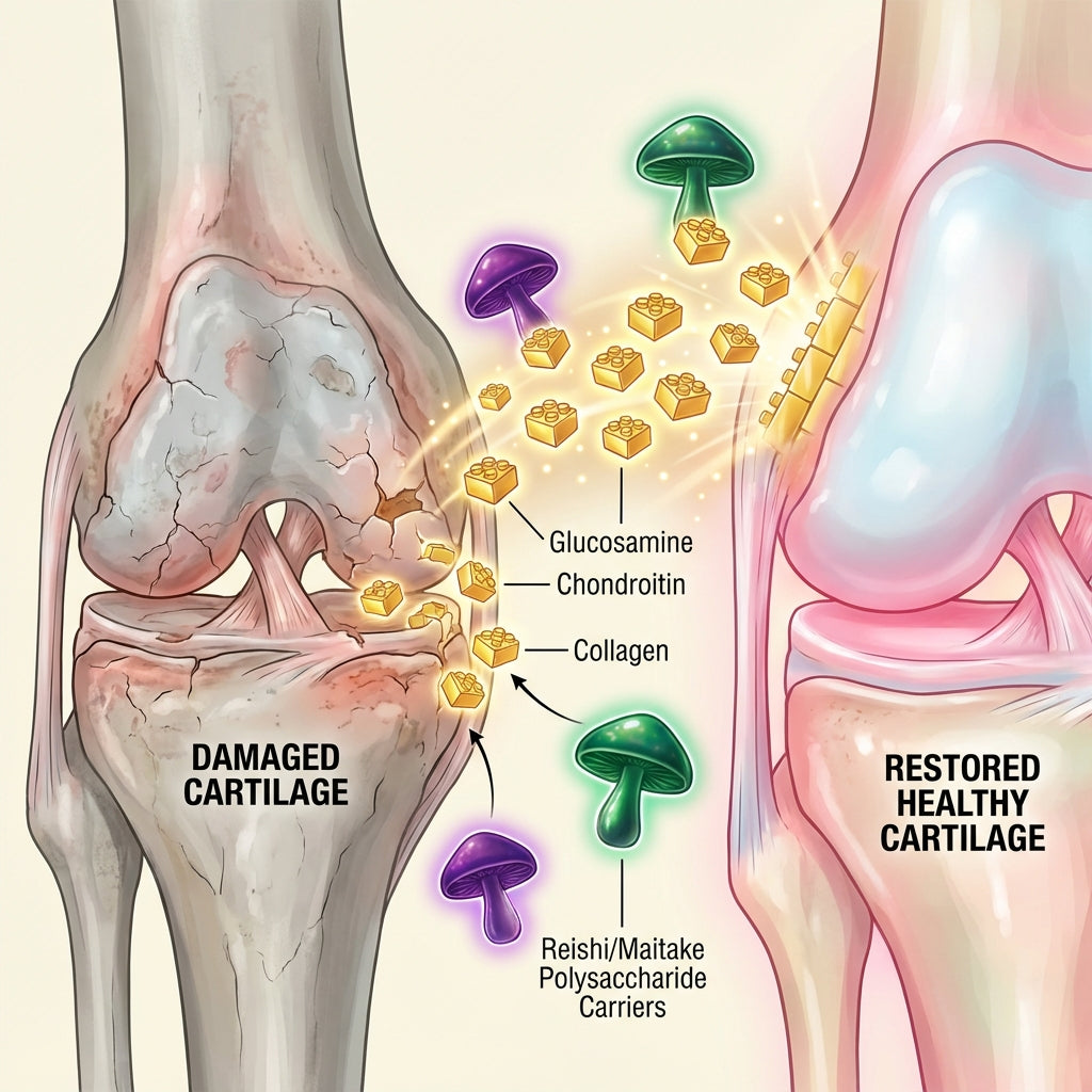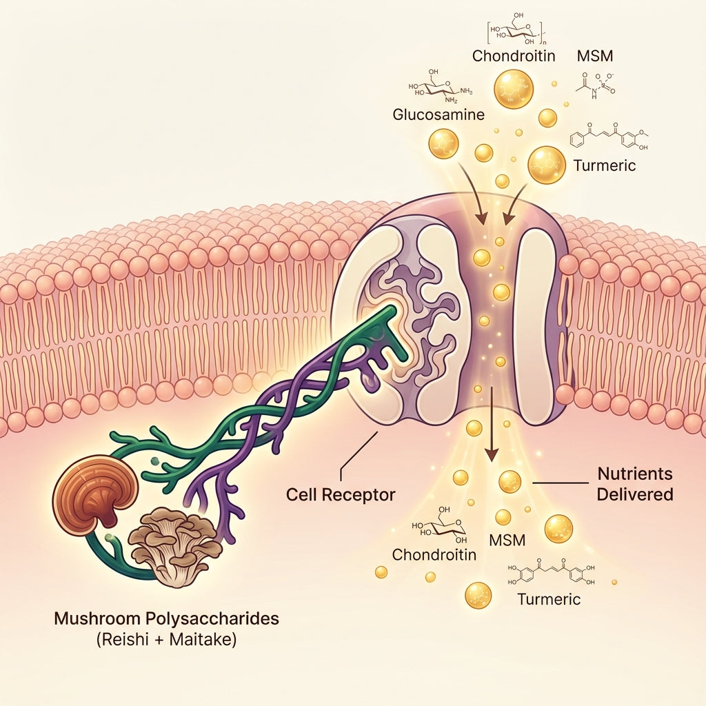 Flexa uses a unique mushroom delivery system. The Reishi and Maitake polysaccharides help your body actually absorb the joint-healing ingredients instead of passing them through unused. This tackles inflammation at the root while supporting joint repair and mobility.