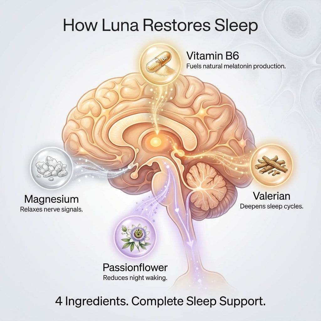 One ingredient can't fix all of that. That's why Luna uses seven—working together across three sleep pathways.